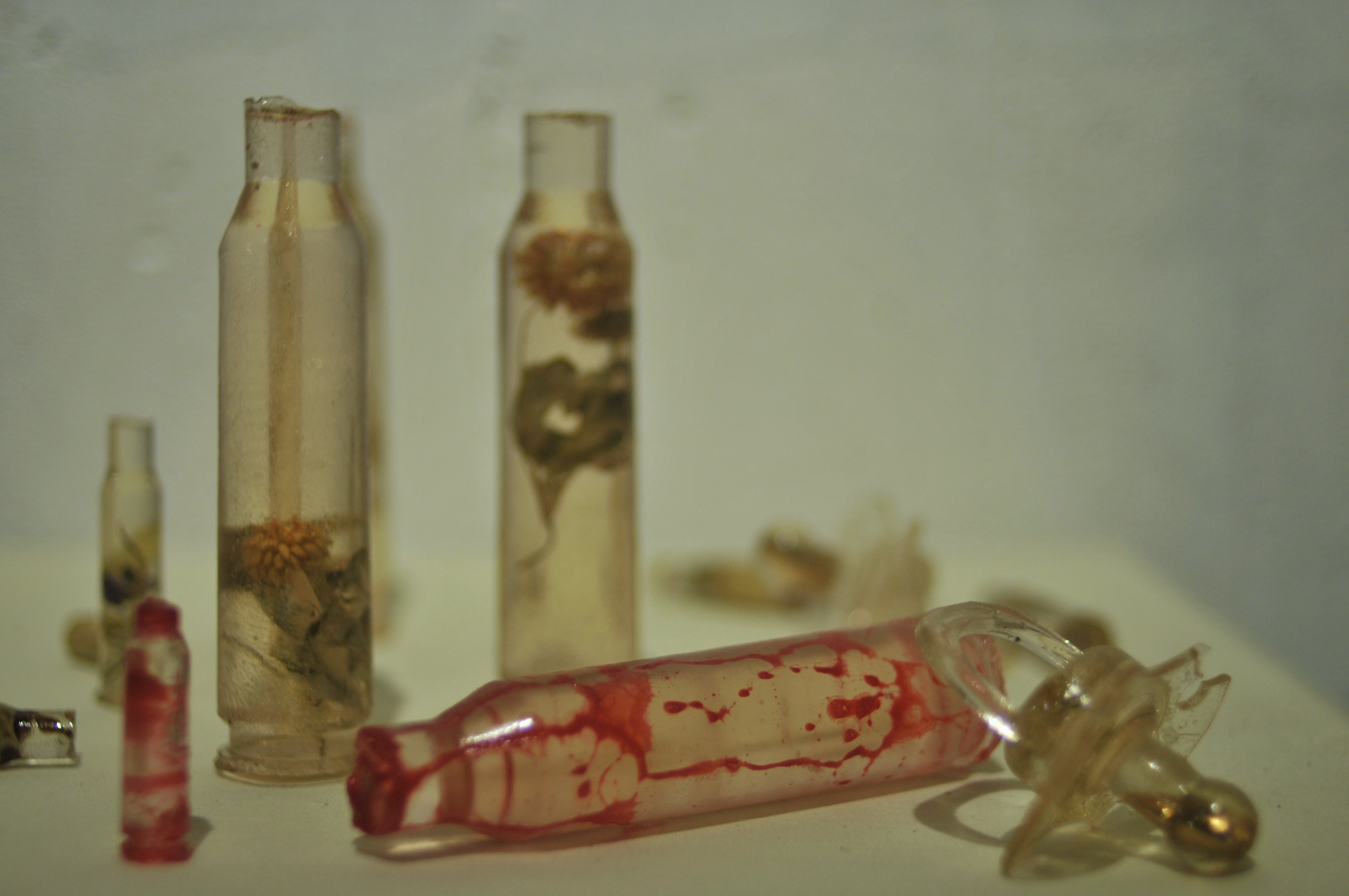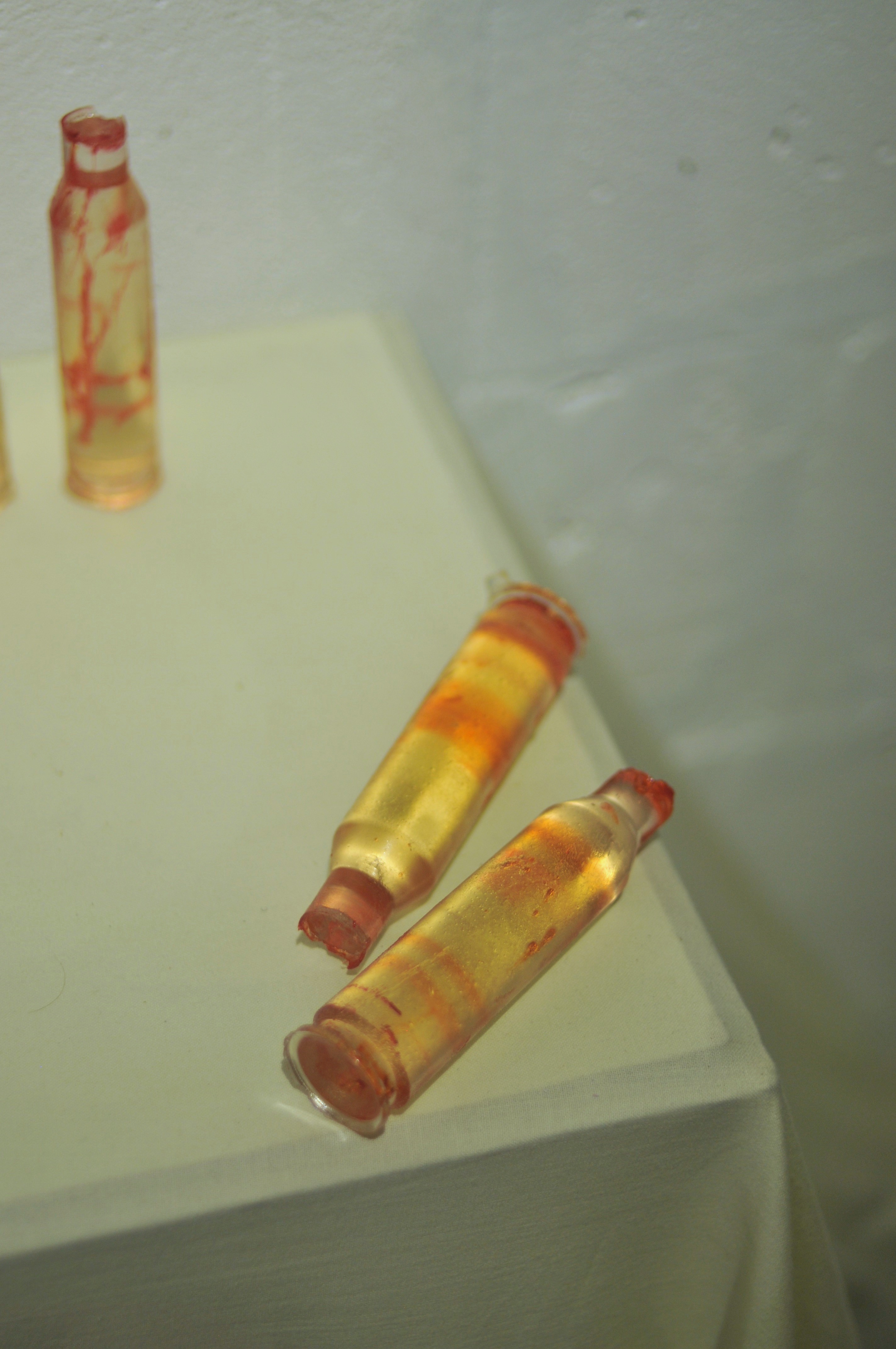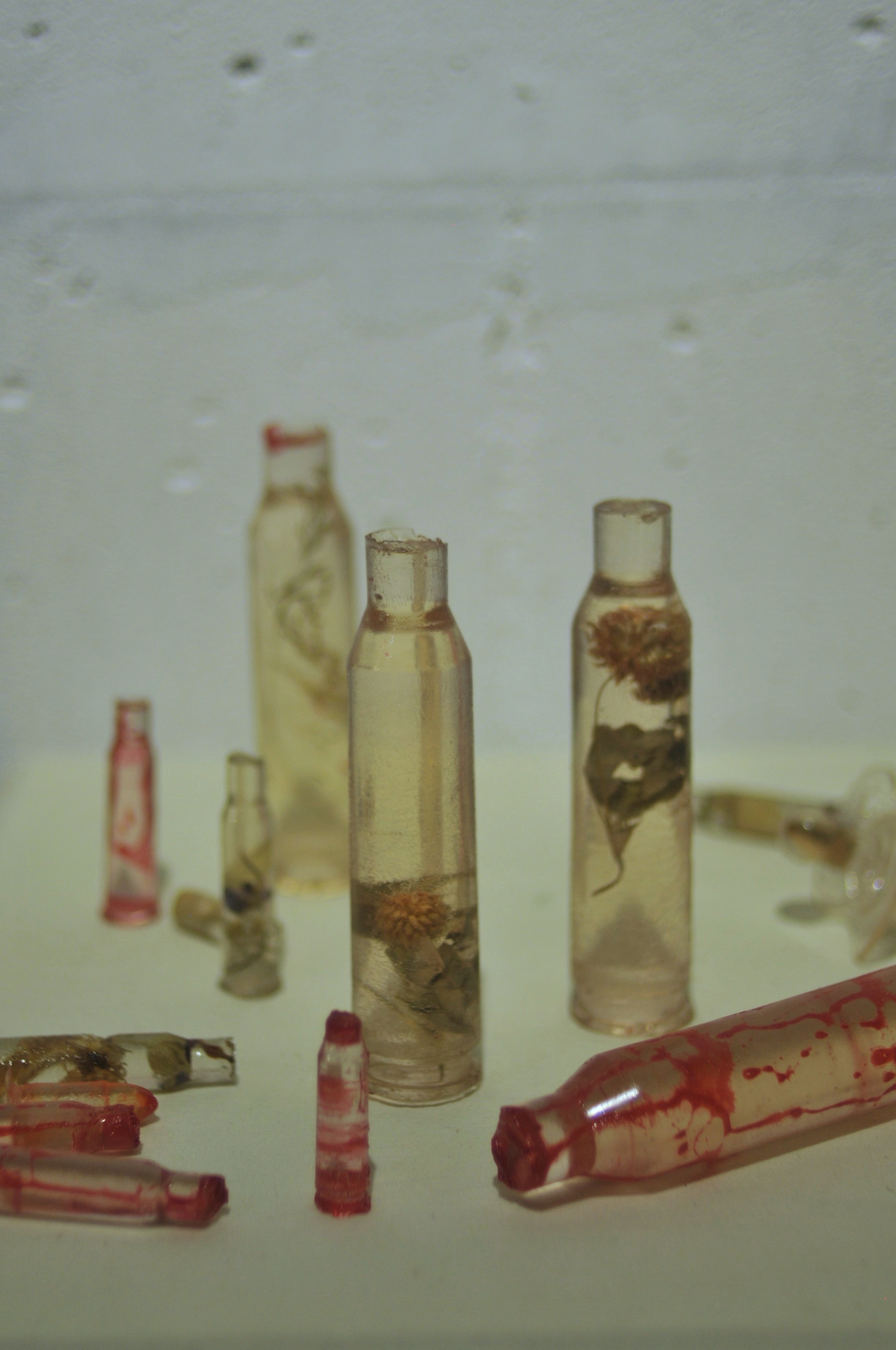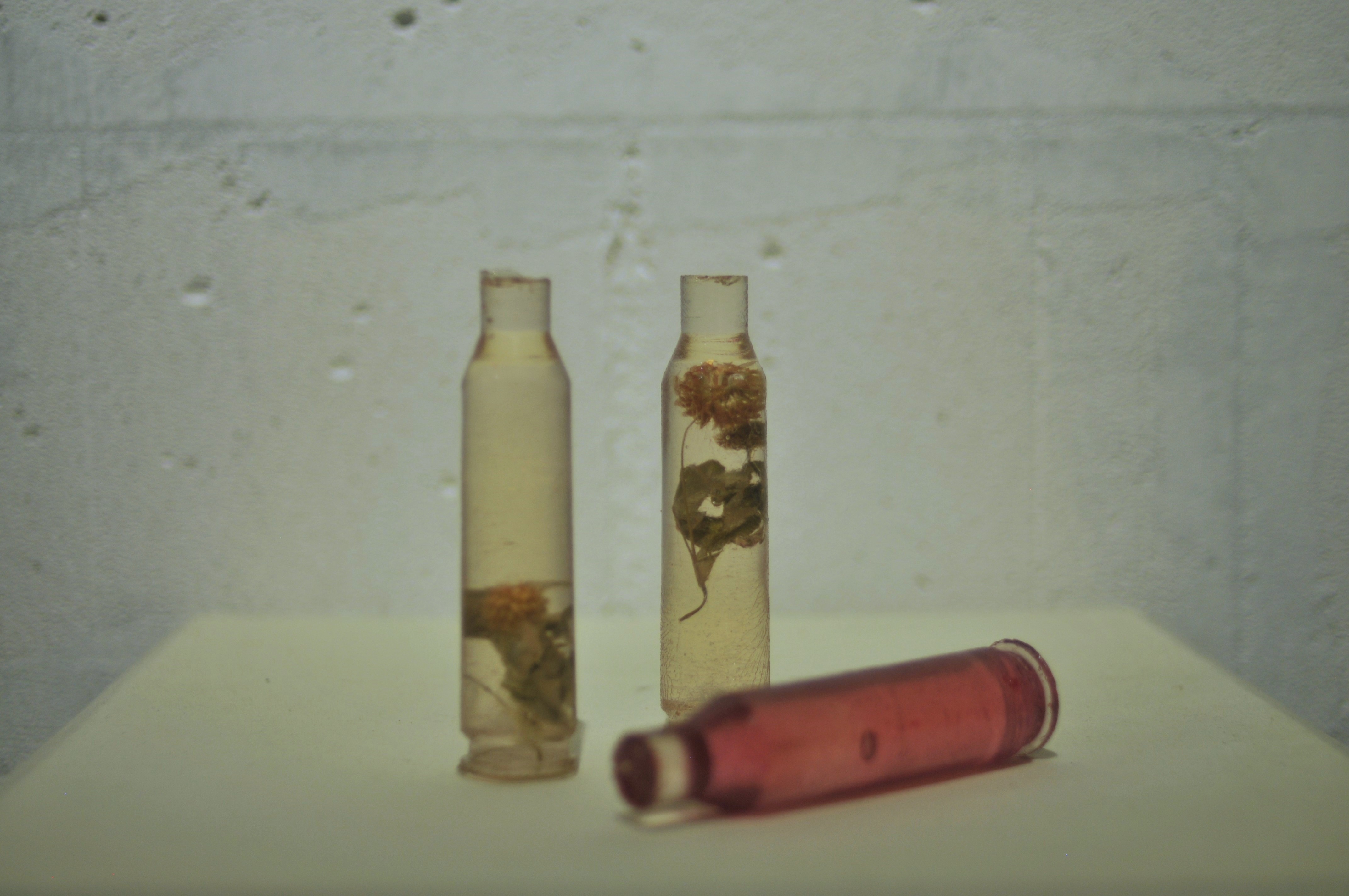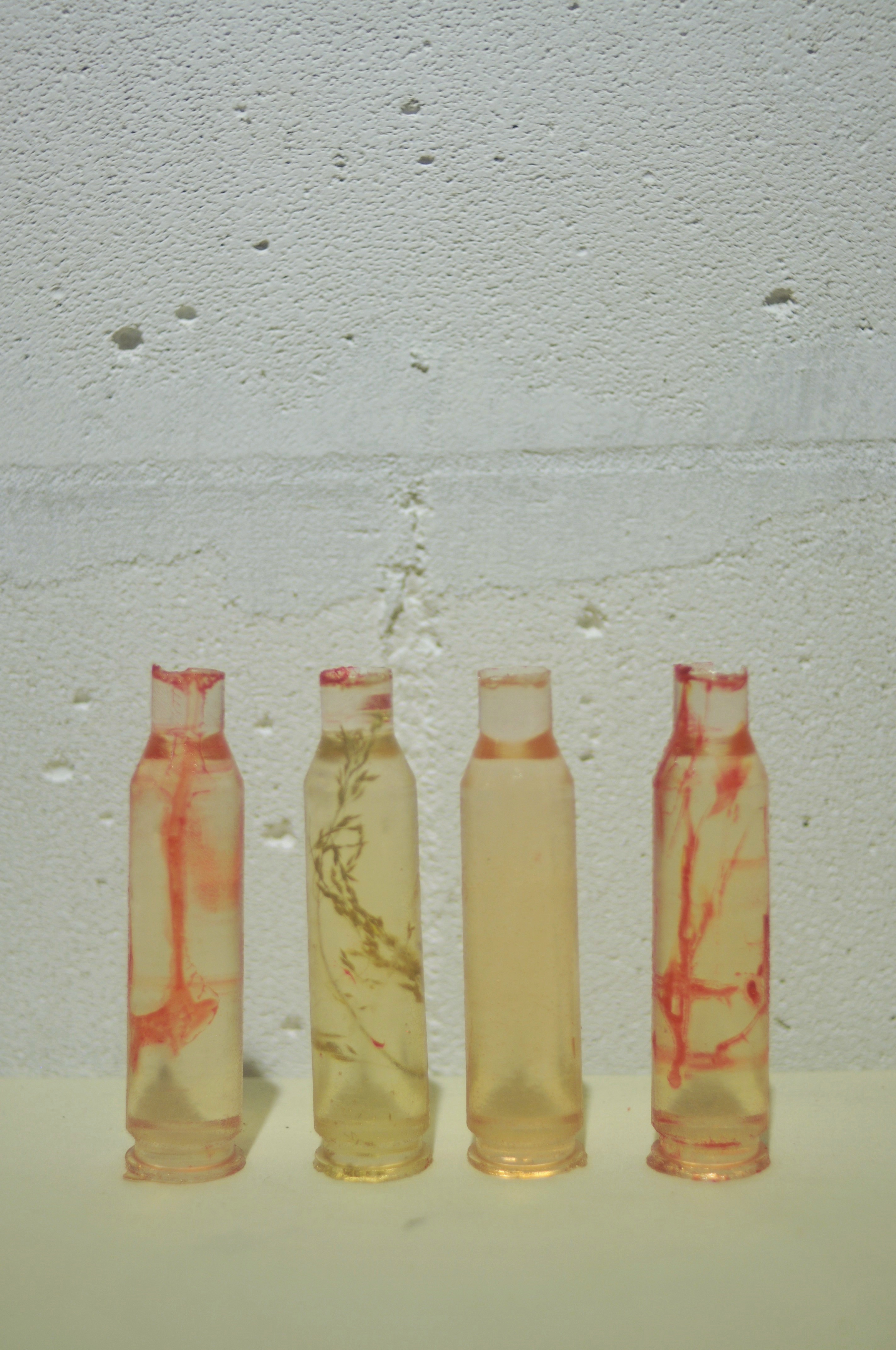 Polyester resin, dried herbs and flowers, dyes, casts made from real used cartridges that circulated in the hands of those connected to the front line