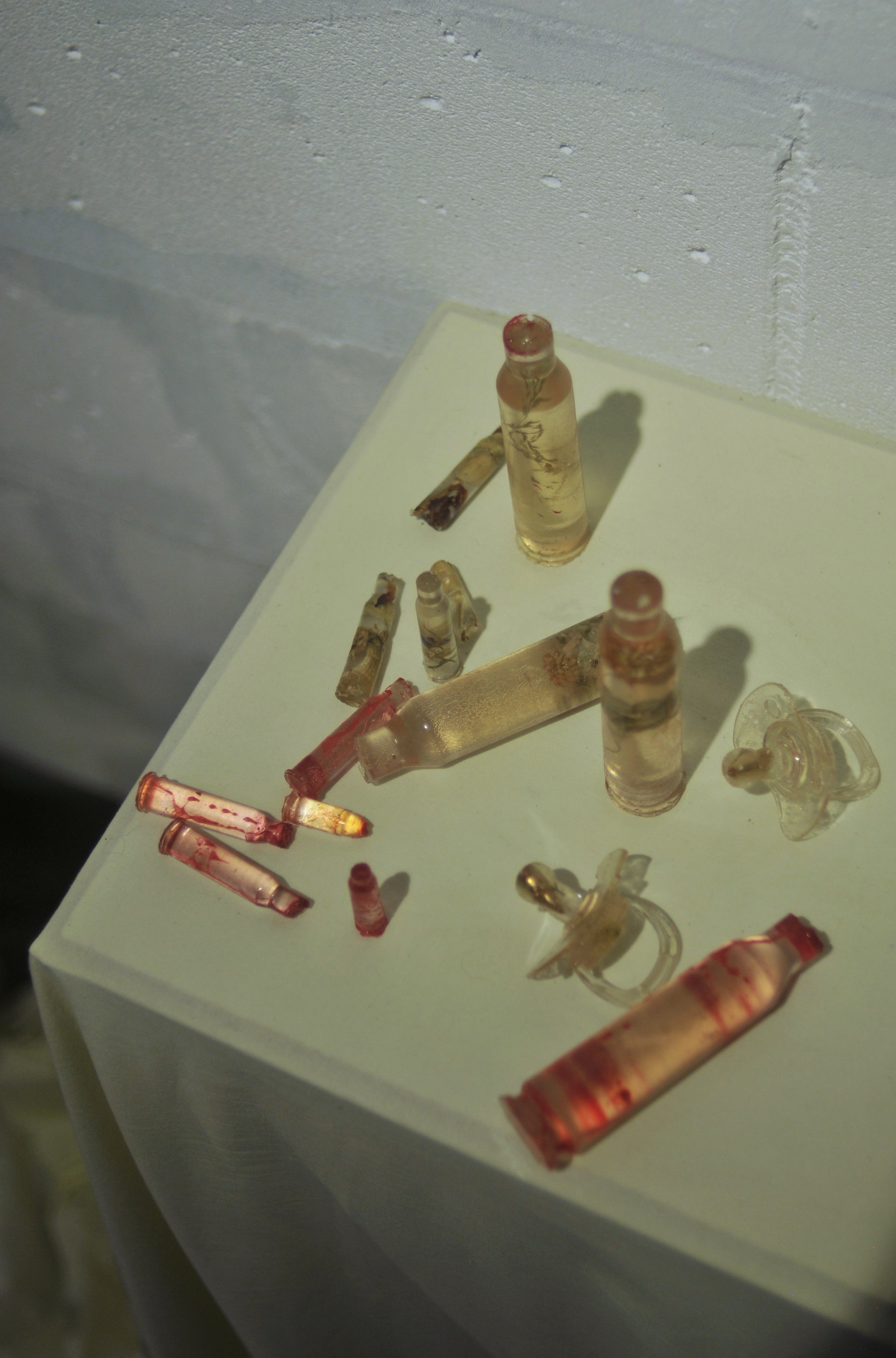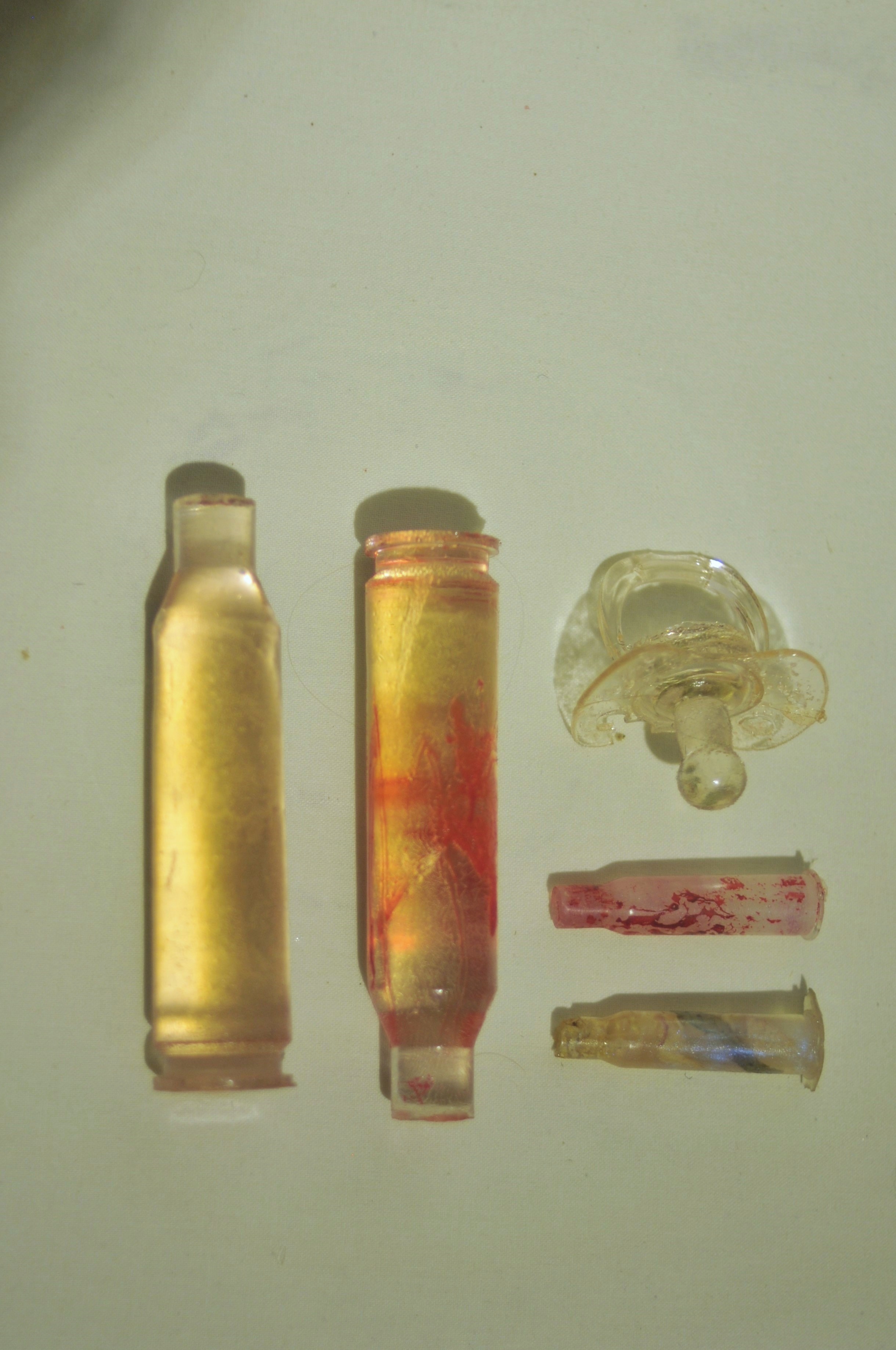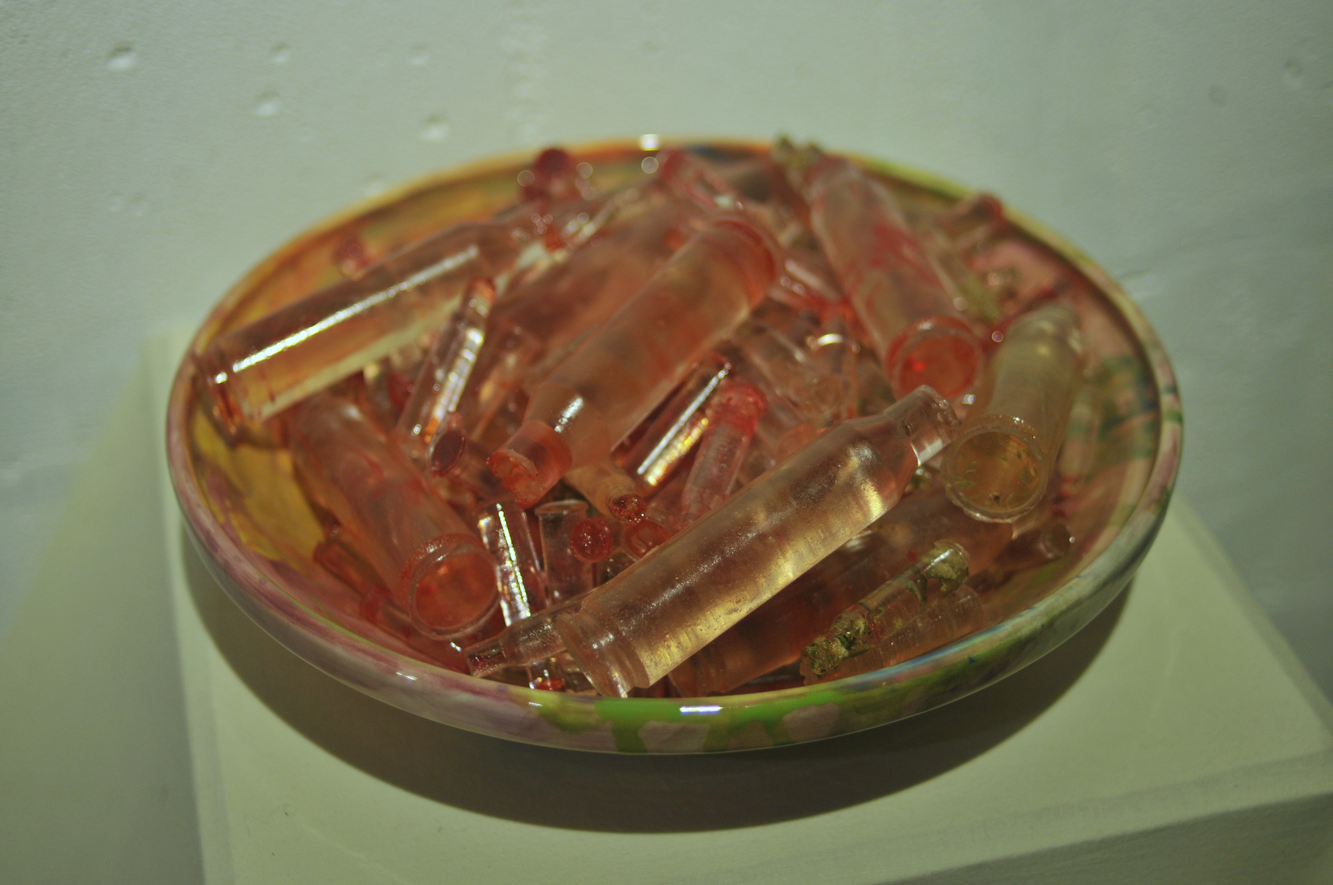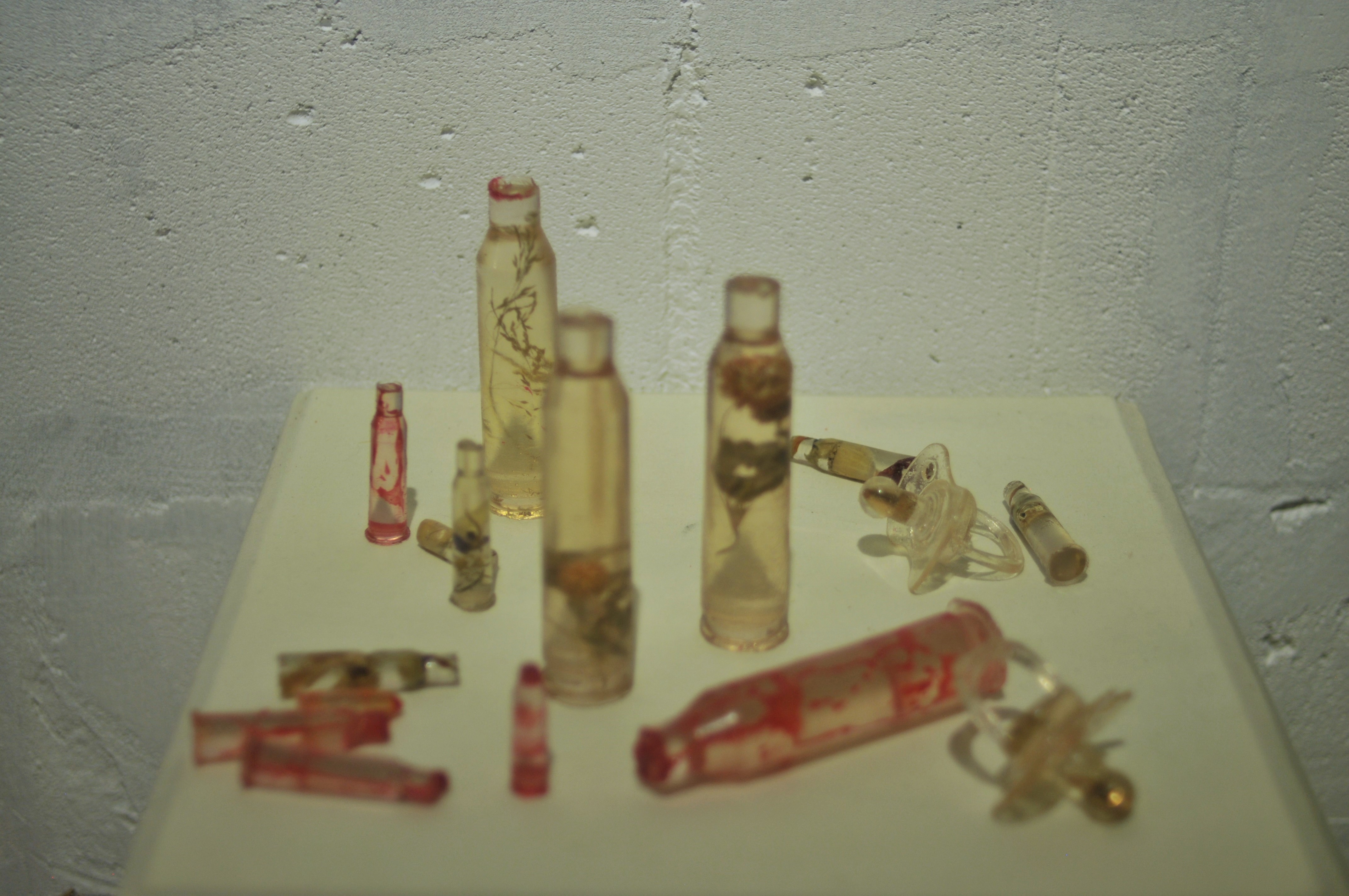Polyester resin, dried herbs and flowers, dyes, casts made from real used cartridges that circulated in the hands of those connected to the front line