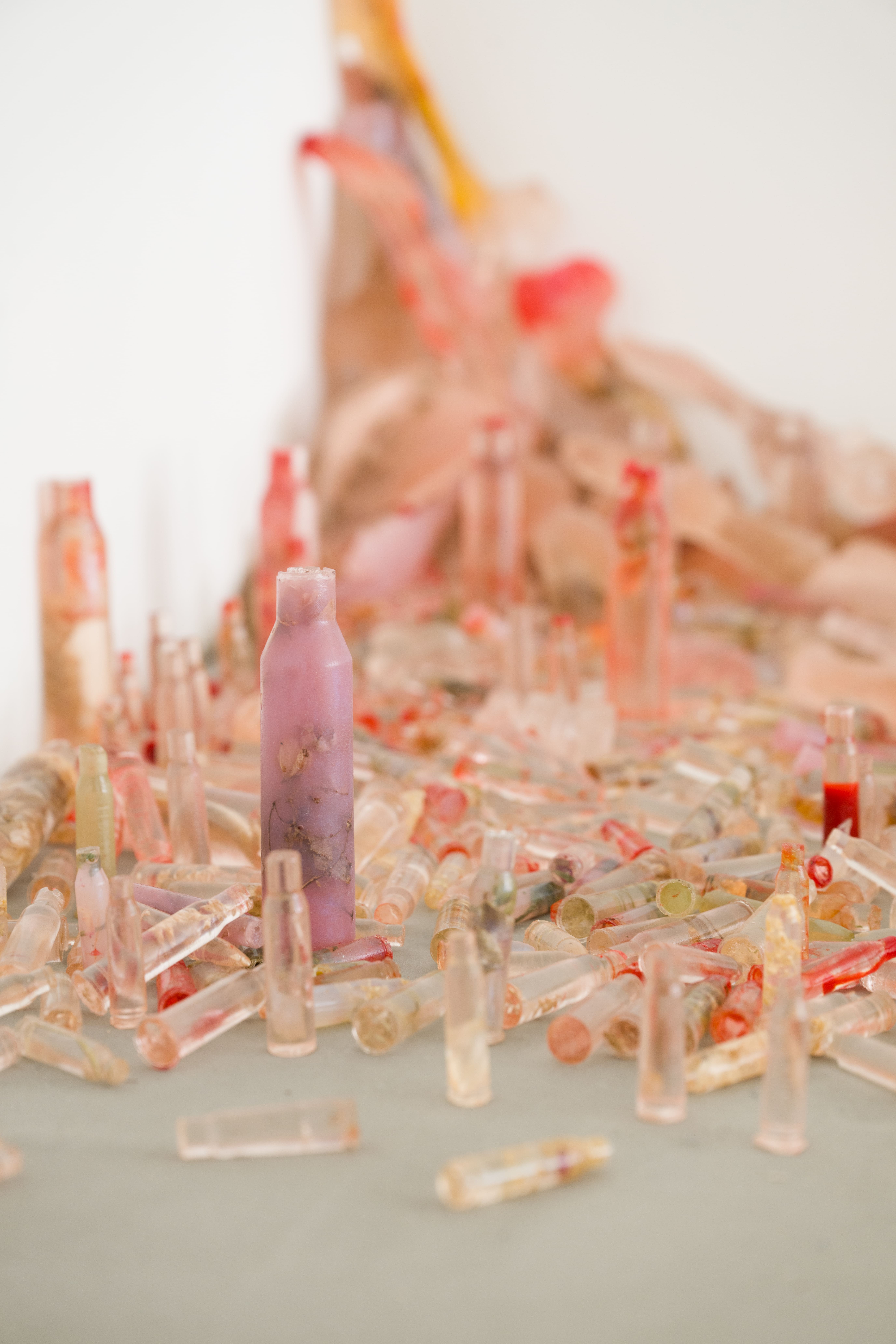 These objects recall at once laboratory test tubes — used to analyze blood, trace illness, and seek the right treatment — and refined perfume flacons, carriers of luxury, celebration, and beauty. Perfume, too, is born from extracts of herbs and flowers, distillations of nature’s memory into the body.