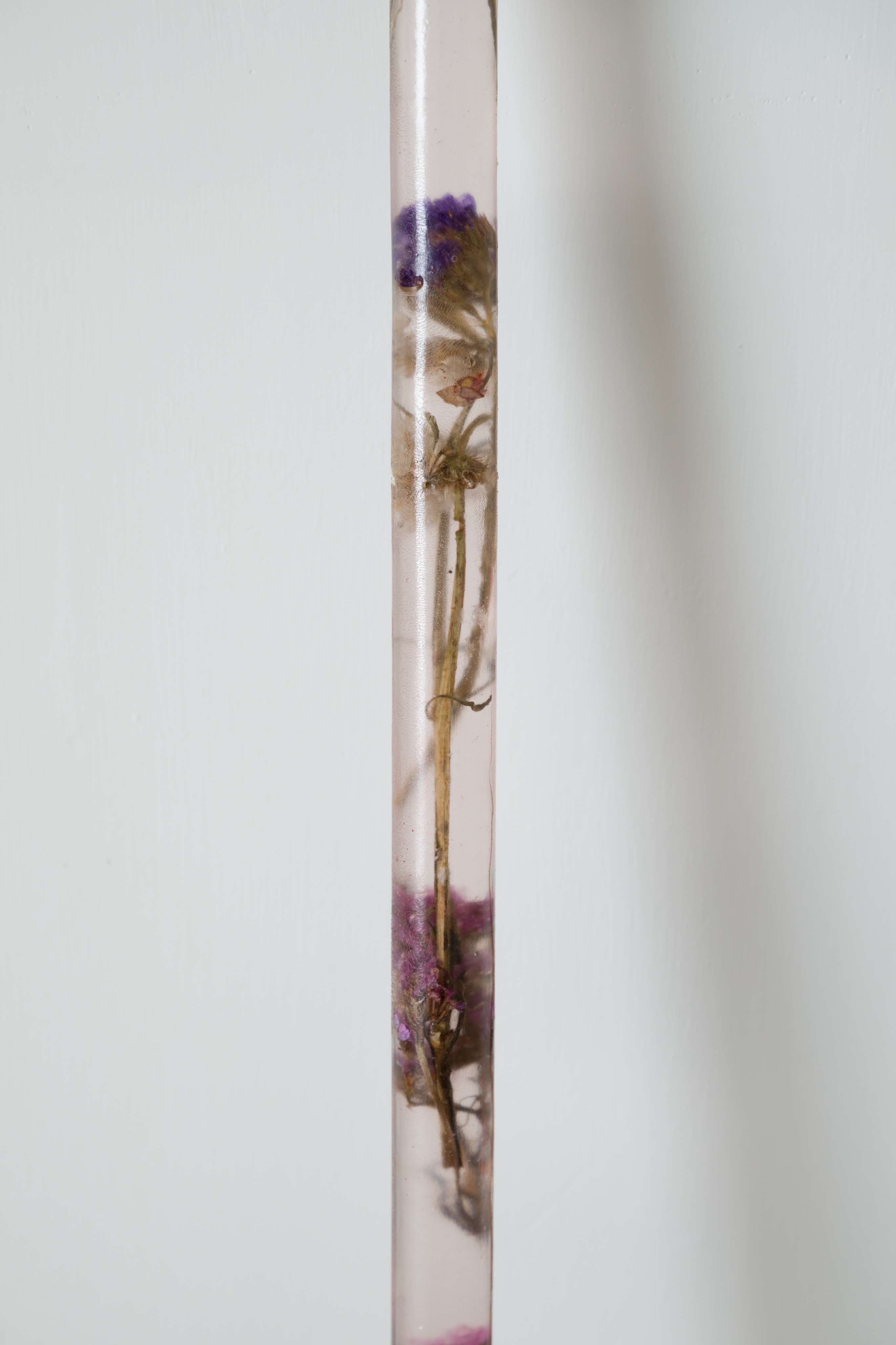 The sculptures appear monumental, yet their material — polyester resin — is more fragile than glass. It has no frame or reinforcement, only vulnerable dried flowers within. The flowers are as brittle and aged as the body of a grandmother-healer who was a lifelong support for her family. In their fragility one reads the experience of generations: even those who sustained others are themselves in need of support.