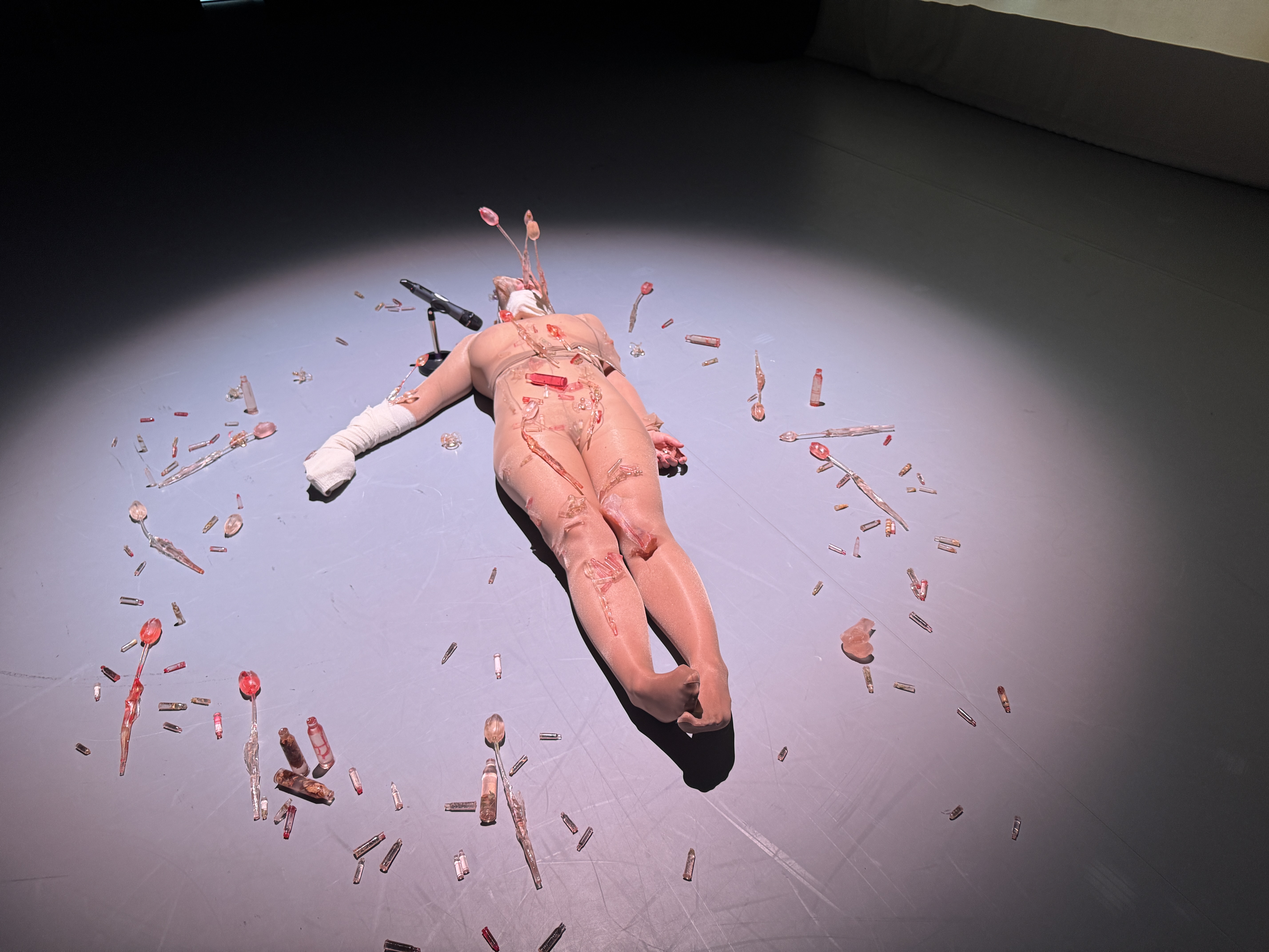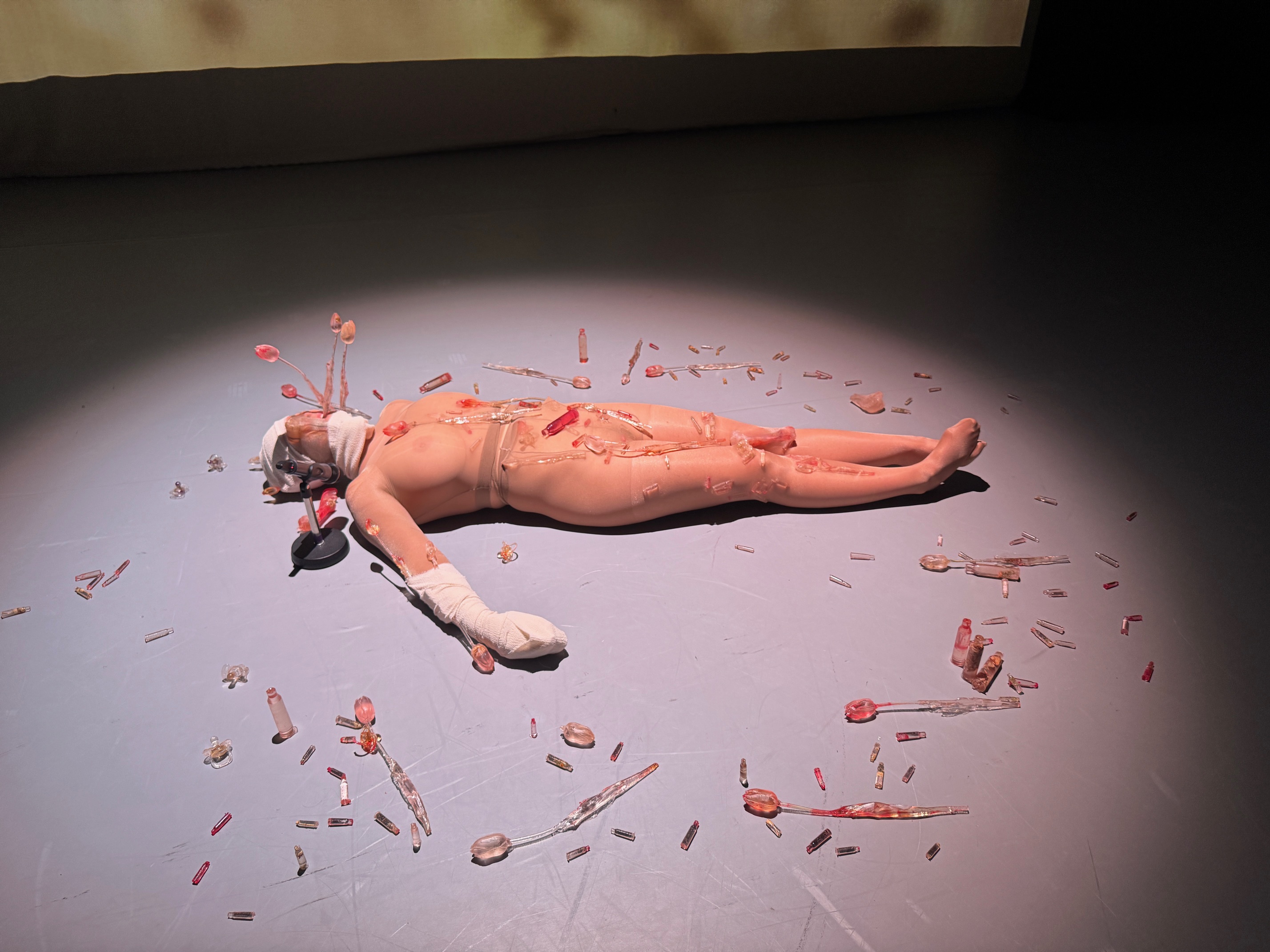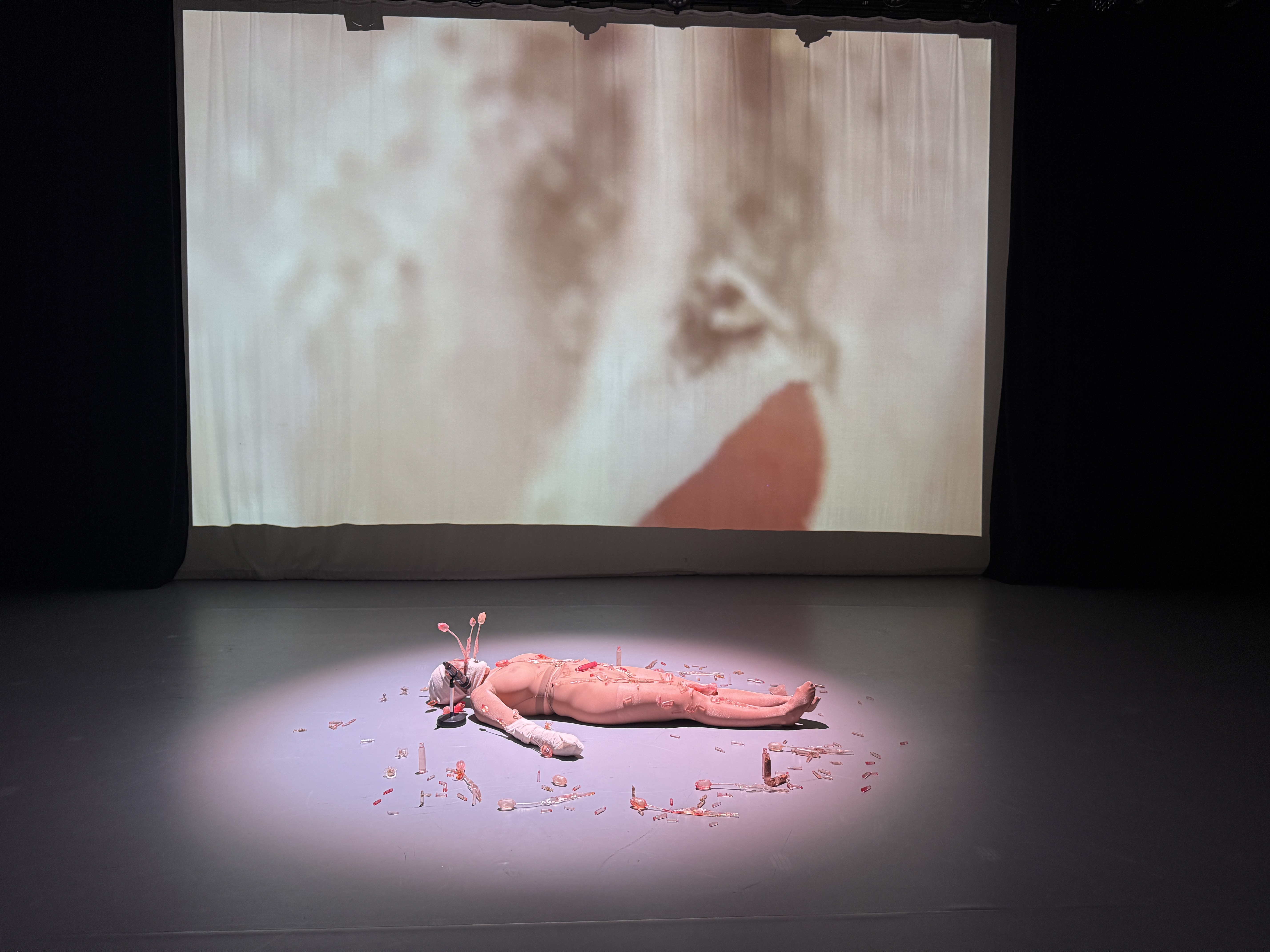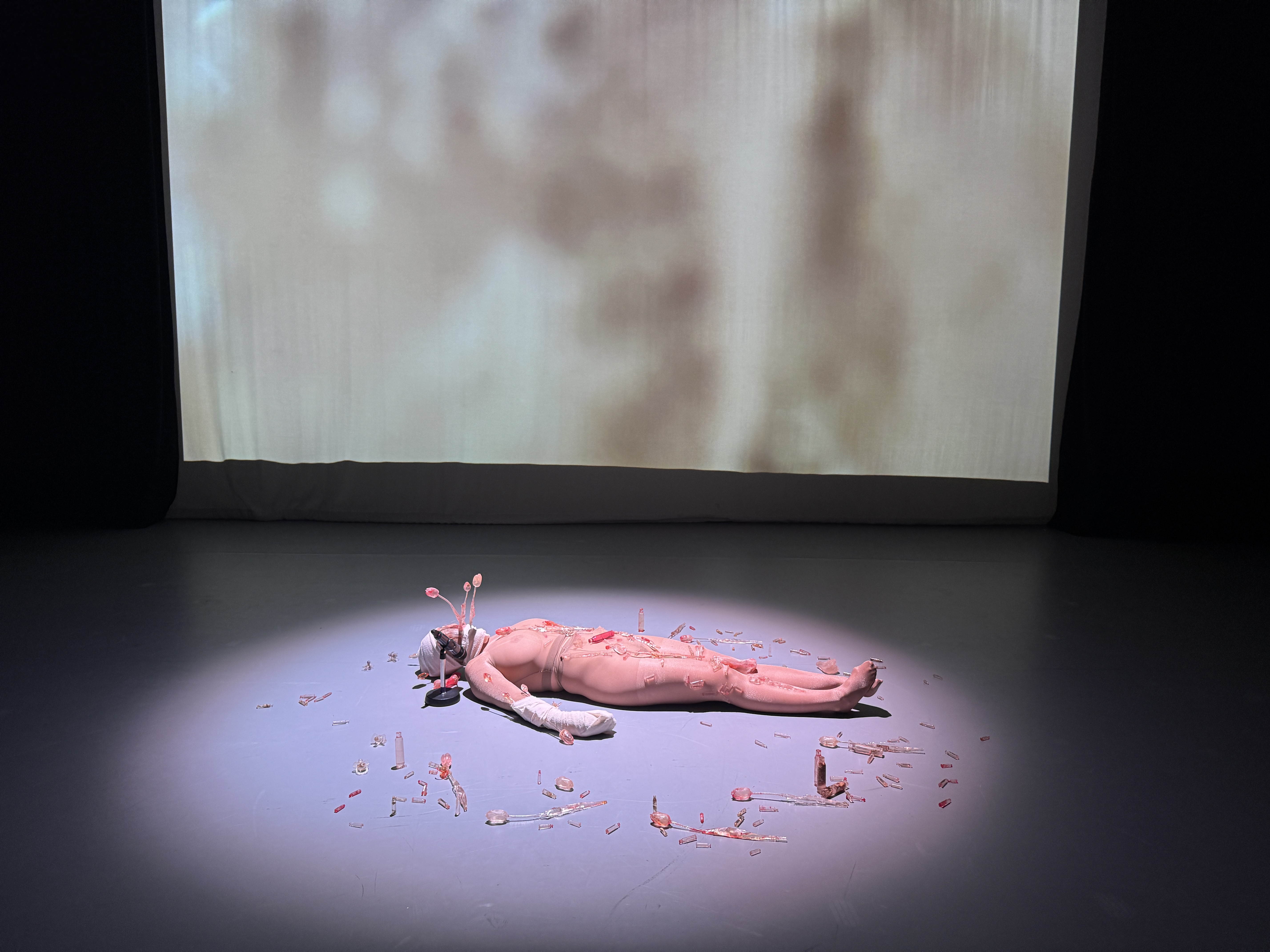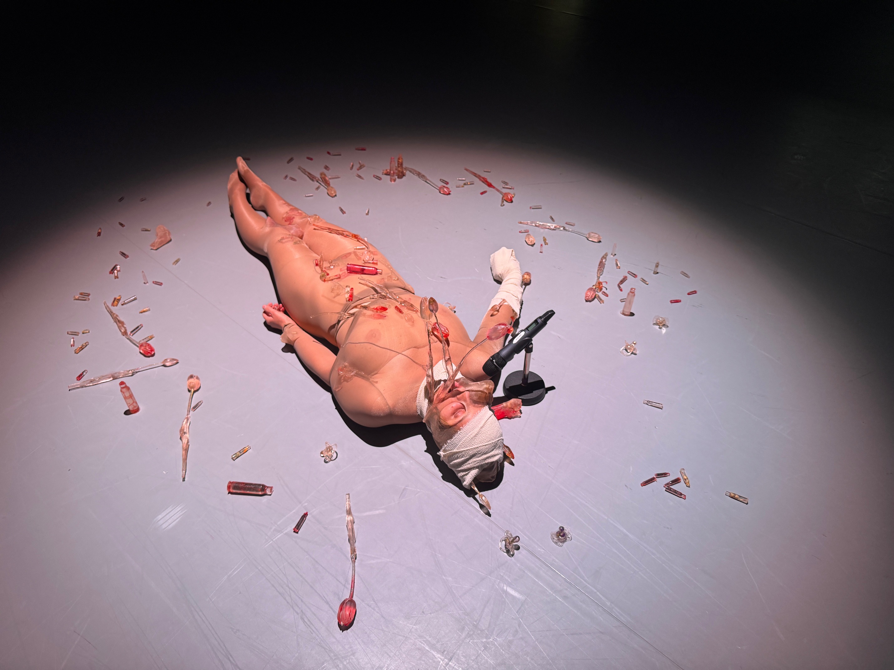 In the performance, my body lies on the floor, wrapped in bandages and nylon — a fragile double skin. Around me are flowers I have made by hand, cast from tulips in transparent resin with herbs, casts of bones, and bullet shells filled with red pigment and flowers. There are also pacifiers from my daughter, never used but transformed into transparent capsules of memory and healing. I try to unwrap myself, breathing into a microphone, while on a large screen, my mouth releases bones, shells, pacifiers, and flowers. My voice recalls my grandmother’s “recipes” of healing herbs.