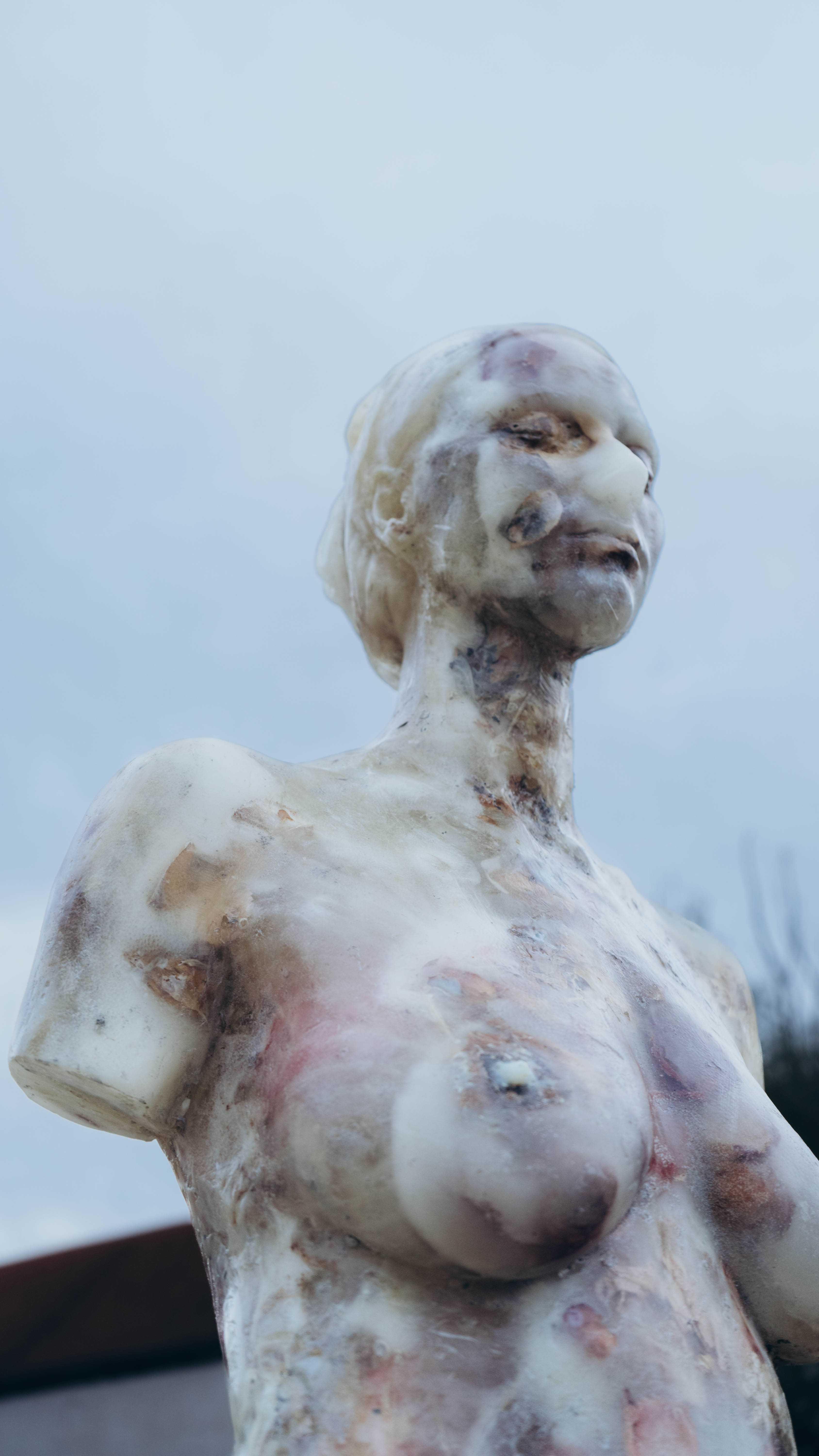 «Фігура з квітами №…, Лютий 2024 року» — старий зліпок тіла художника, зроблений у 2017 році. Матеріали: епоксидна смола, металевий каркас, сухі квіти